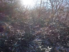 急斜面を登り切ると、地形図から読み取れるよりも細くて小さなアップダウンのある尾根となる。左はシャクナゲはないが、とても歩けない急斜面、尾根上と右斜面はシャクナゲに覆われる。これだけまとまって多くのシャクナゲを見るのも、こんなにナゲ藪を漕ぐのも初めてだ。花が咲く時期にはさぞかし見事ではないかと思う(ただし、この辺りはヤマビルの生息域と聞くので、実際に観に行くかどうかは考えものだ)。