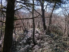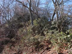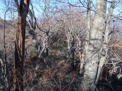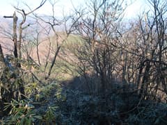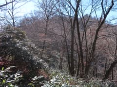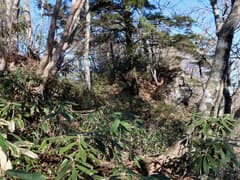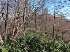 ここから、さらに尾根を辿って大須山を目指す。幅広い尾根を緩く下り、登りに転じると急な斜面となる。丈の低い笹が現れ始め、登るに連れて丈が高く、密になってくる。また、ポツポツとシャクナゲが現れる。