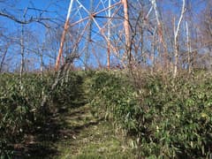やがて、紅白鉄塔が建つ大須山が見えてくる。大須山の左(東)側を巻くと巡視路入口があり、笹原を綺麗に切り開いた道を少し登れば、巨大な紅白鉄塔の基部に着く。大須山の頂上は目と鼻の先だが、けもの道さえない程びっしりと深い笹藪に覆われている。諦めて笹藪に突入。腰高の笹原を漕いで頂上に登り着く。