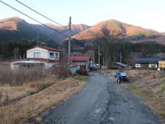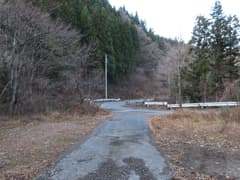 雨見橋を渡って数分の地点にゲートがあるが、開いている。さらに数分で立派な舗装道に出る。車道を下り、畑地に出たところで右の枝道から合瀬集落に入る。