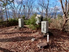 頂上は冬枯れの木立に囲まれ、展望は木の間越しにしかないが、雰囲気は明るい。三角点標石と石祠、「奉納石森権現」と刻まれた御影石の立派な石碑2基がある。