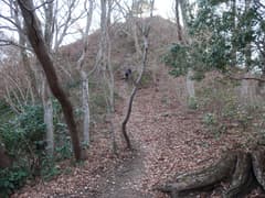 尾根上の遊歩道を登り、尖ったピークを右から回り込んで反対側から登る。ロープが張られた短い急坂を上がると、絹谷富士の頂上に登り着く。