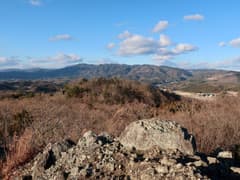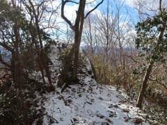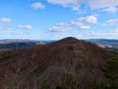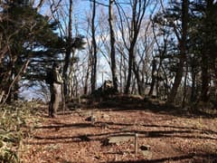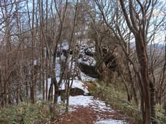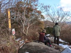 稜線はこの先でちょっと下ったのち、巨石が積み上がった小ピークを起す。ごく短い区間だが、急坂に薄く雪が積もっていて滑り易い。登り着いた小ピークには「鬼ヶ城山 山頂 標高887m」と「鬼ヶ城 西峰山頂(892m)」の二つの山名標識がある。展望は素晴らしい。南側には山麓のキャンプ場を俯瞰し、その向こうには見渡す限りなだらかな山並みが広がる。展望盤があり、屹兎屋山(きっとやさん)や神楽山(かぐらさん)などの山名が記されているが、いずれも顕著なピークではないので、同定が難しい。北側は木立に遮られるが、ひときわ高く大滝根山が眺められる。展望を楽しんでしばし休憩し、昼食のパンを齧る。風は強くないのでそう寒くはないが、じっとしているとしんしんと冷え込む。