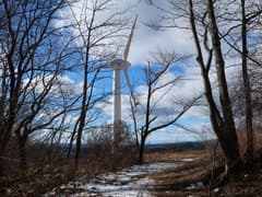 風力発電機の脇を通り、桜が植樹されたカヤト原を抜けて、樹林に覆われた緩斜面をトラバースすると、未舗装の林道に出る。コースは良く整備されていて、要所に道標がある。