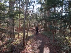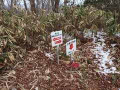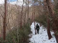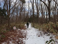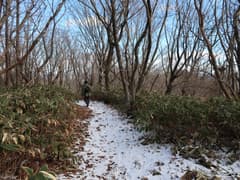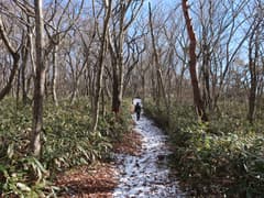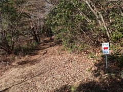 しばらく林道を辿って、山腹を下り気味にトラバースする。やがて道標があり、再び山道に入る。笹を切り開いた尾根道を緩く登り、左斜面のトラバース道に入って、二つ程、細い水流を横切る。マムシ注意の看板があるが、もちろんこの時期は心配ない。