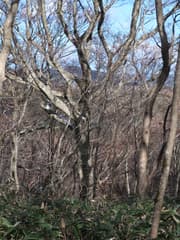 一応、登山靴に履き替えて出発。アセビやモミに覆われた広く緩い尾根を登ると、三角点標石とケルンのある閼伽井嶽頂上にあっさり着く。樹林に覆われて展望は乏しい。閼伽井嶽薬師側は結構急な斜面だ。往路を引き返して鞍部へ戻る。