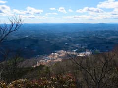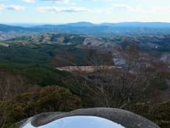 頂上は大きな岩塊から成り、樹林から突き抜けて360度の展望が得られる。周囲には小さな尾根と谷が入り組んだ低い山地が広がる。東に太平洋を望む。西に見える鍋を伏せたようなゆったりとした山容の山は、明後日行く予定の水石山のようだ。