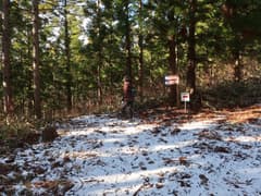 ききり荘の右脇から瀟洒なバンガローの間を上がる。さすがに正月にこの山奥で冬キャンする人はいないようで、ひと気はない。キャンプ場の外れから道標に従って登山道に入り、花崗岩の大岩が散在する冬枯れの雑木林を緩く登る。やがて左に大きな風力発電機が見えてくると、東西のコースの分岐に着く。西コースから東コースへ周回する計画なので、ここは左の西コースへ。