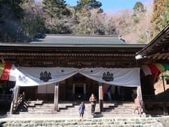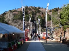 境内には露店も出て参拝客で賑わっているが、2日なのでそう混雑はない。参道石段を登って、本堂にお参りする。本堂は杉檜の大木に囲まれ、神さびた雰囲気がある。