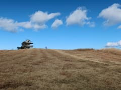 少し戻って展望塔へ。三角点標石は展望塔の前にある。塔に登ると360度の展望が得られ、北方にひときわ大きな山容の大滝根山を遠望する。水石山は車で容易に登れる山であるが、草原が広がる平坦な頂上は開放的で展望も素晴らしく、訪れる価値ありと思う。