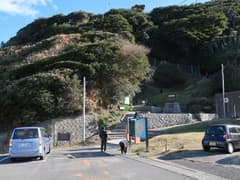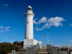 塩屋埼灯台の登り口には広い駐車場と土産物店があり、大勢の観光客で賑わっている。ジグザグの階段道を登って岬の丘の上に出ると、白亜の灯台を高く仰ぐ。