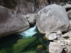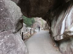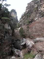 車道の終点から巨石が累積する渓流沿いの遊歩道に入る。右には天狗岩の岩壁が迫り、前方に覚円峰の岩峰が聳立する。昇仙峡の代表的な景観で、直に見るとなかなかの迫力。