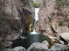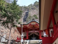仁王門を潜ると、その奥には急傾斜の参道石段が一直線に続く。石段の脇はこれまた急な岩盤に一筋の水が流れる沢で、前滝と呼ばれている。石段を登ると、頭上に陽に照らされた大岩壁が現れ、その中央部を水が流れて帯状に黒く光る。これはなかなか凄い滝だ。この滝は雄滝(男滝)といい、落差140mと称している(甲州市観光協会HP)。石段を登り切ると、雄滝を背にして、大滝不動尊の新しく朱も鮮やかな本堂が建つ。雄滝は水量は少ないが、見上げるように高くて威圧感がある。これは一見の価値あり。
