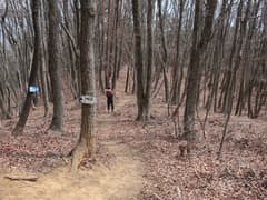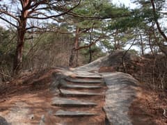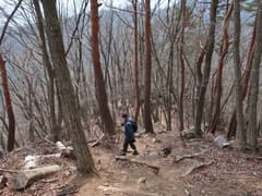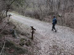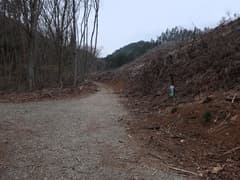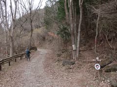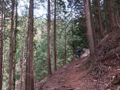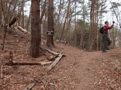 帰りは最短コースをとって山腹コースを下る。露岩の多い小尾根の急降下は、階段が整備されているので歩き易いが、ここを登ったら一汗かくだろうな。ひとしきり下ると山腹をトラバースする道となり、程なく林道に出る。駐車場へは僅かな距離だ。