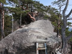 所々に花崗岩が露出し、風化した白砂に覆われた稜線上の登山道を歩く。S&Sはお疲れなので、次の小ピーク(展望台)で引き返し、私だけ先に進む。弥三郎岳はちょっとした岩峰となり、短い梯子や階段で花崗岩の岩場を登る。お酒の神様を祀る弥三郎権現の小さな祠を過ぎ、岩場に刻まれたステップを登って、弥三郎岳頂上の岩頭の上に立つ。
