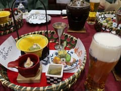 今回の宿は石和温泉にある「石和名湯館糸柳」。石和温泉駅に近く、田園の中に建つ近代的な宿だ。温泉へ浸かったのち、夕食のご馳走を頂く。メインの鯛のしゃぶしゃぶや和牛溶岩焼きの他に大変品数が多く、かつ、一つ一つがどれも美味しくて、食事を堪能した。