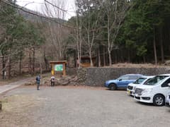 R140の旧道を北に向かい、「春日居小学校北」交差点を左折。R140のバイパスのガード下を潜り、果樹園が拓かれた斜面をジグザグに登って、春日居ゴルフ倶楽部の手前で右折。山腹をトラバースする林道に入る。既にだいぶ高度を稼いでいて、甲府盆地を見下ろす眺めが良い。尾根を回って谷に入ると、兜山登山口駐車場があり、ここに車を置く。既に車が5台程あり。WCや案内看板もあって、事前情報の通り、良く整備されている。