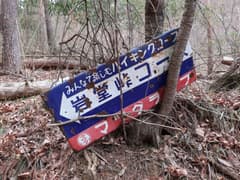 登山口から渓流に沿って未舗装の林道を辿る。今日は雲が多い天気で、谷間の道はちょっと薄暗くて寒々しい。途中で兜山に直登する山腹コースを右に分ける。このコースは急そうなので、復路で下りに使う予定にしている。なおも谷間の林道を緩く登る。この道は岩堂峠を越えて積翠寺に抜けるハイキングコースで、前回も歩いている。途中にはマツダランプの道標があり、古くから歩かれていることを偲ばせる。