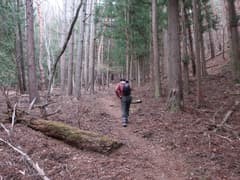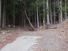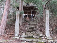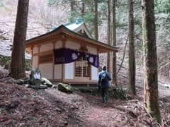 急斜面のジグザグ登りは天狗堂の古びた堂までで、ここから山腹をトラバースするほぼ水平な山道となる。金界坊の新しい堂の前を通り、さらにトラバースすると未舗装の林道に出る。