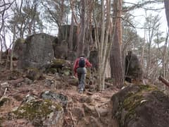 ここから稜線上の登山道を辿って兜山の頂上に向かう。ゆるゆると登ると露岩の多い稜線となり、標高990m地点を越える。このピークは兜山(標高913m)より高いが、樹林に覆われて展望はなく、標識の類もない。
