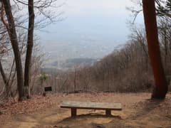 稜線を緩く下り、左に夕狩沢に下る落ち葉に覆われた道を分ける。その先に少し進んだところが兜山の頂上だ。三角点標石のほか、山梨百名山の山名標柱とベンチがある。樹林に囲まれて展望はないが、すぐ先に展望台があるらしい。行ってみると南面の樹林が切り開かれて甲府盆地の眺めが広がる。ベンチもあるので、ここで休憩。昼食のパンを齧る。