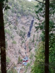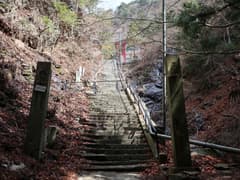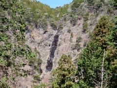林道を右に行けば甲州高尾山。棚横手山へは林道を左へ辿る。途中、杉林の切れ間から大滝不動尊を俯瞰して雄滝の全貌を拝めるビューポイントがある。