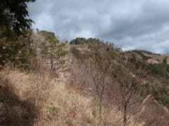 再び山腹コースを右に分け、広い伐採斜面を見上げながら林道を辿る。やがて林道の終点に達し、岩堂峠への山道を左に分ける。兜山は右の山道へ。浅い窪を上がり、それから小尾根を辿ると稜線上に登り着く。