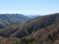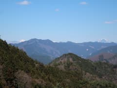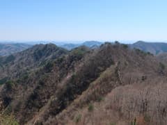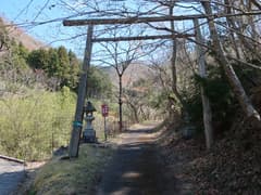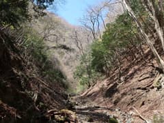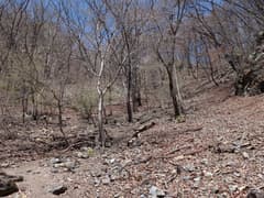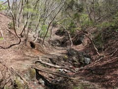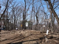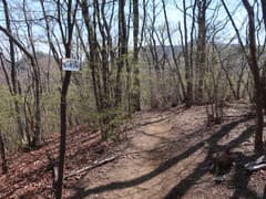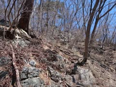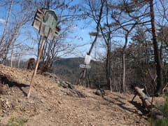 水流は段々細くなって、三つめの小滝を越えたところで涸れる。浅い谷間を登り、「熊の分岐へきつい難所 小俣第二小児童会」と書かれた古い標識を過ぎると傾斜が増して、冬枯れの雑木林の斜面をジグザグに登る。最後は岩場混じりの短い急坂を上って、尾根上の「熊の分岐」に着く。こちらにも小学生が作った道標があるが、殆ど朽ちかけている。
