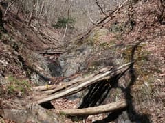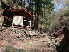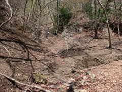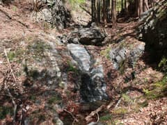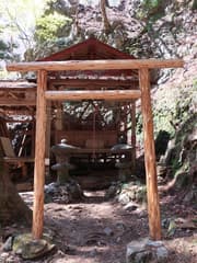 不動の滝を越え、なおも渓流沿いの道を辿ると、生不動に着く。拝殿の奥の岩壁に木の祠が祀られている。次の小さな滝を過ぎると、かつてマンガンを採掘したという岩切鉱山の跡があり、金網に囲まれて埋もれかけた坑口がいくつか残っている。