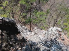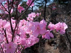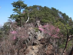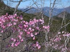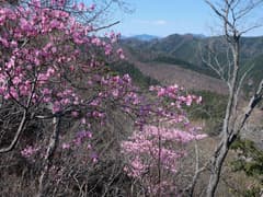 犬帰りの鎖場を下ると露岩の多い尾根となり、赤松に混じってアカヤシオが群生する。この辺りのアカヤシオも、よく見ると花びらの端が傷んでいるのがわかるが、花の数はまあまあで、そこかしこにピンクの群れを見る。