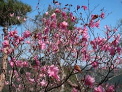 猪子山の手前辺りに、今回、一番綺麗なアカヤシオがあり、アップで撮影。左手にはまつだ湖を隔てて赤雪山を望む。湖畔の桜は満開で、ここから見ても見事だ。