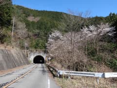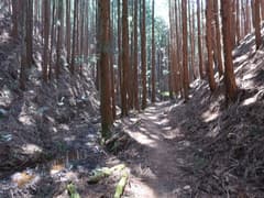 猪子山の頂上を過ぎた辺りでアカヤシオは打ち止め。新緑の雑木林に覆われた稜線を緩く下る。薄暗い杉林に入ると、山神宮の石祠のある猪子峠に着く。ここで右折して浅く緩い谷を下ると、県道名草坂西線に出る。車道をダラダラと下り、駐車地点までは7分程の距離だ。休憩込みでちょうど4時間半の軽い山歩きであったが、変化に富んだ沢コースと展望の良い岩尾根を歩き、アカヤシオも見ることができて、楽しい気分で帰途についた。
