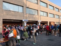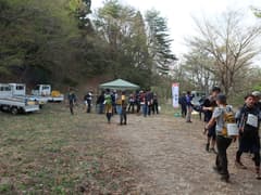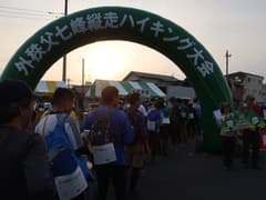 翌朝、駅前の松屋で朝食をとったのち、始発電車で小川町に移動し、5:48着。大勢の参加者と共にスタート会場の小川町役場に向かうと、役場前の広い駐車場に受付待ちの長い行列ができている。15分程列に並び、受付でコースガイドと参加賞のマップケース、栄養ドリンク、飴を貰ってスタートする。