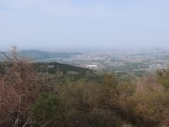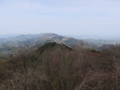 定峰峠から緩やかにアップダウンする稜線上の山道を辿り、次のCPのある大霧山の頂上へ。頂上から行く手に登谷山を望む。薄く雲が広がって、陽射しが弱まった。