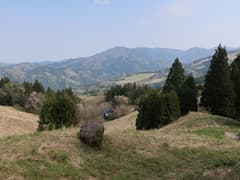 和紙の里の裏手から山に取り付き、山腹を絡んで上がる車道を歩く。リュウゴッパナ(494m三角点峰)は山道でショートカット。再び車道に出て、萩平の集落に下る。のどかな山村風景が広がるところで、奥には大霧山の頂が見えている。