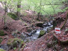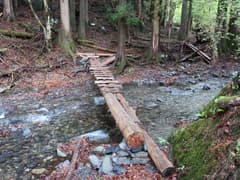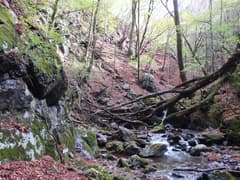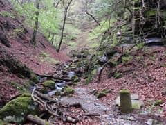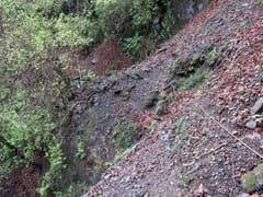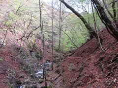 炭焼き窯の跡を過ぎると、高巻き道と沢沿いの根本古道(増水時は通行不可)に分かれる。遡るにつれて水量は減って問題ないので、古道に入る。しかし、足元が柔らかくてズルズル滑る。ここは高巻き道の方が楽だ。すぐに高巻き道と合流して、沢を何度か渡り返す。丸太橋(シオジ橋)を渡って左岸を進むと、岩壁の基部に十丁、ロープを伝って九丁の丁石を見る。