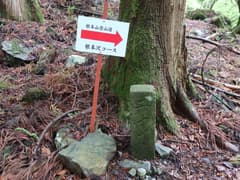 前回はなかった登山口の道標を見て、不死熊橋に向かう。不死熊橋手前の広場にも根本山瑞雲倶楽部が設置した「根本山参詣路の歴史遺産案内図」があり、地形図上に遺物の位置が示され、簡単な解説も付されていて、大変参考になる。