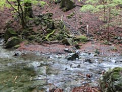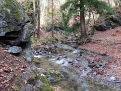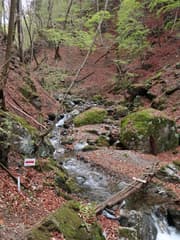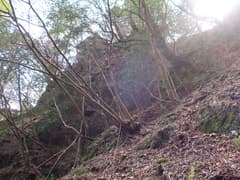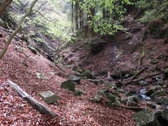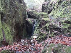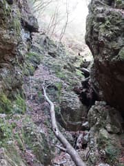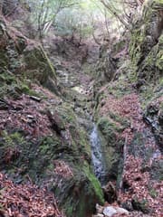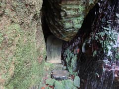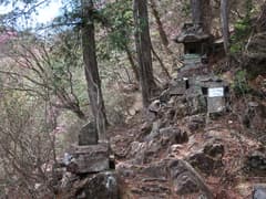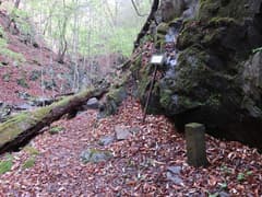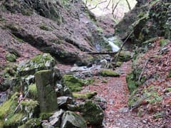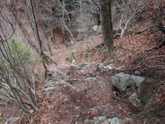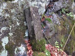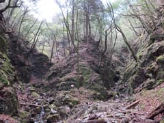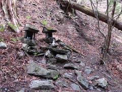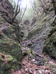 二俣の右に入ると、また直ぐに二俣となり、左が従来から登山道となっている裏坂、右が復活した表坂となる。ここからが今日の山歩きの主題だ。表坂は小さなゴルジュで、覗き込んで目を凝らすと(写真では判らないが)奥の岩壁に石祠があるのが見える。