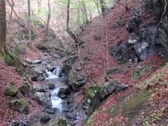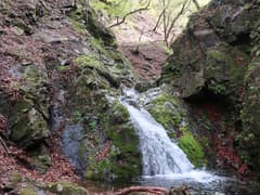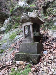 表坂に入って登ると小滝(不動の滝)があり、滝下の岩陰に不動明王の石像がひっそりと祀られている。