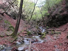 石祠の左手に続くミニゴルジュを登る。ゴルジュを抜けると、左の頭上に根本山神社が見える。緩い新道と急な旧道に分かれるので、旧道へ。かなりの急斜面を固定ロープで攀じ登る。古い鎖も残っているが、腐食が進んでいるので使用できない。