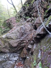 魚止の滝の右岸に張られたロープを登ると、高巻き道と新設の水線通しの道に分かれる。前回、高巻き道はかなり高い所をトラバースして怖かった。ここは新しい道へ。ロープと鎖でへつり、岩場の段差は設置されたボルトを足場にして下る。