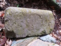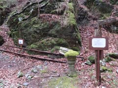 沢沿いに進むと、2017年5月に沢の中から引き上げられたという鈴台が置かれている。説明板によると、「鈴臺」と刻まれた文字の間にあるマークは根本山神社のシンボルの天狗の羽団扇で、法具を一時的に置く台として使われたとのこと。これはなかなか貴重な遺跡ではなかろうか。