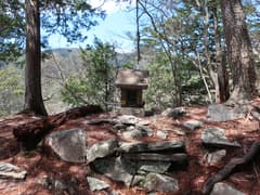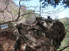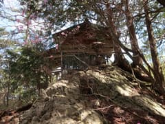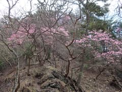 急斜面を這い上がって根本山神社に登り着く。表坂は短いながら、沢登りっぽくてとても楽しめた。神社にお参りしたのち、根本山の頂上に向かう。途中、散発的にアカヤシオが咲いている。ここから先の道の状況は、前回と変わった点はほとんどない。途中の灯籠台の跡のある岩場に獅子岩の標識が付いたくらいだ。