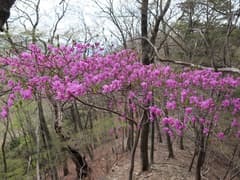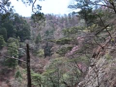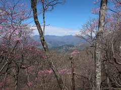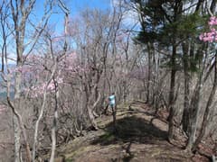 奥社を過ぎ、行者山に登り着く。前回の山行記録ではこのピークを峰の平としていたが、歴史遺産案内図によると行者山と呼ぶらしい。行者山からの下りにも古い鎖があり、これも江戸時代のものとのことである。点々と咲くアカヤシオを愛でつつ、尾根を辿る。中尾根十字路からひと登りして、根本山の頂上に着く。