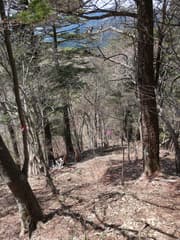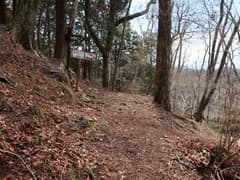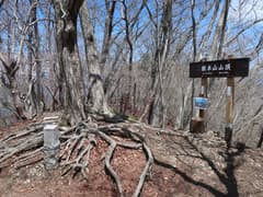 今日の山歩きの目的は既に達成しているので、あとはサクッと中尾根を下る。途中、登ってくるハイカーさん数組と交差。石祠を過ぎると杉植林帯に入り、林道に下り着く。ここの道標も随分立派なものになった。すっかり春の陽気となって、林道歩きが暑い位だ。駐車地点には正午に戻る。時間が早いので、車はまだほとんどが残っている。