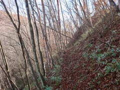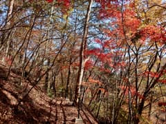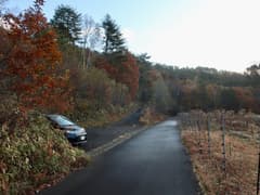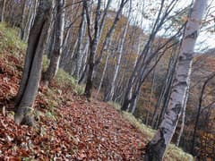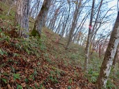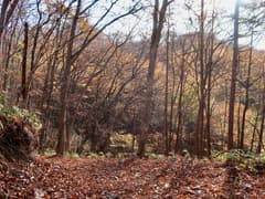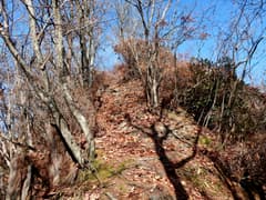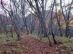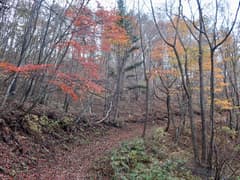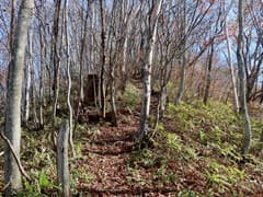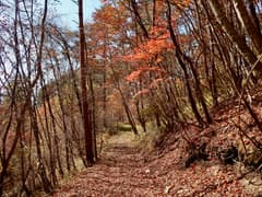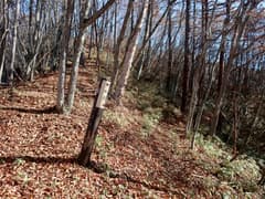 登山道に入ると未舗装の作業道となり、なだらかな尾根の南面を絡んでゆるゆると登る。まだ朝の冷気が残り、路上の落ち葉はしっとりと濡れていて、晩秋の雰囲気。やがて日が高くなると、作業道にも陽が差し込んで名残の紅葉を照らす。木立を透かして、行く手になだらかな山影を望む。今のところ、急な登りがなさそうな優しい山だ。