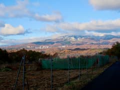 桐生を未明の5時過ぎに車で出発。暮坂峠を越えて町道暮坂引沼線に入り、無名の峠を越えて八石沢川沿いに下る。世立八滝の上端の駐車場を過ぎ、「松岩山登山口」の道標に従って右折。舗装された林道を登ると山上に拓かれた畑地に出て、登山道入口の5台分程の駐車スペースに車を置く。他の車はなし。草津の温泉街と白根山の眺めが良い。白根山の頂には雲がかかり、雲の下の山肌は薄らと白くなっている。昨晩は雪が降ったのだろうか。