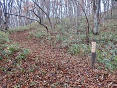 やがて作業道は尾根上で三叉路となり、「マタギ平」の道標がある。ここから山道が分岐し、尾根上に通じている。丈の低い笹が繁茂しているが、道はきれいに刈り払われていて、ルートは明瞭だ。小さな突起は右から巻く。岳樺の白い幹が美しい。
