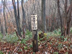 ここには「松岩山まで3.7km」の道標があり、「藪山ファンが多い松岩山(1512.1m)への登山ルート。山頂には二等三角点があり、途中の天狗岩や十二山からの眺望が良い。笹が多いので、ルートの確認をしっかりと」という説明が記されている。英訳も付され、藪山ファンがKabukiyama fansと訳されていてウケる。まあ、確かに傾奇者には違いない。