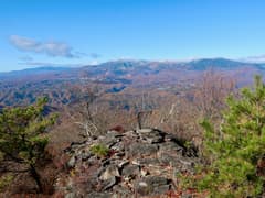 十二山の頂上も、北側が立派な松の木に遮られる他は、ほぼ360度の展望が開ける。特に、小さな谷を隔てて眺める松岩山は何やら風情がある。草津白根山を眺めるとだいぶ雲が外れて、その左奥には四阿山の鋭峰がくっきりと現れる。